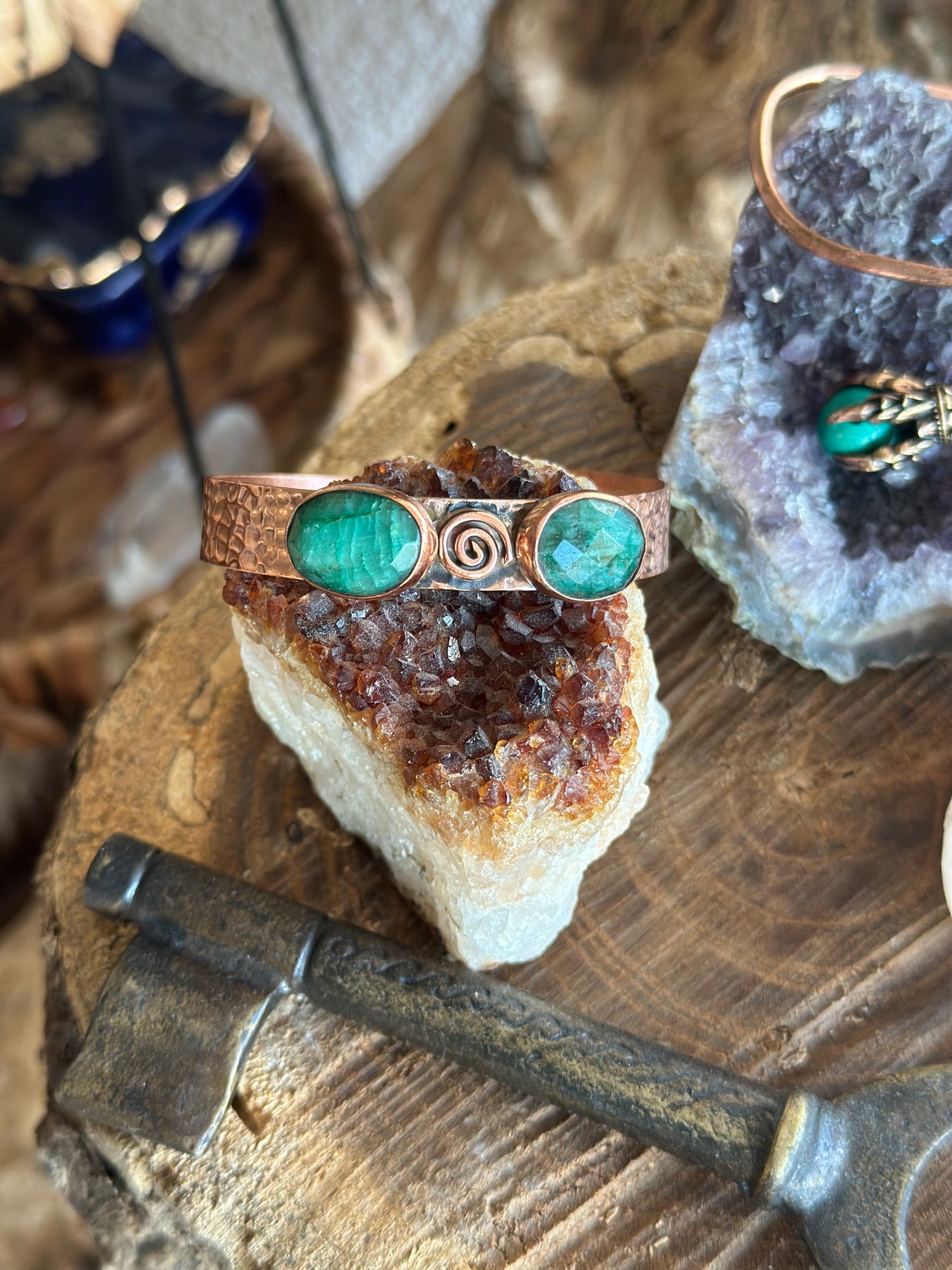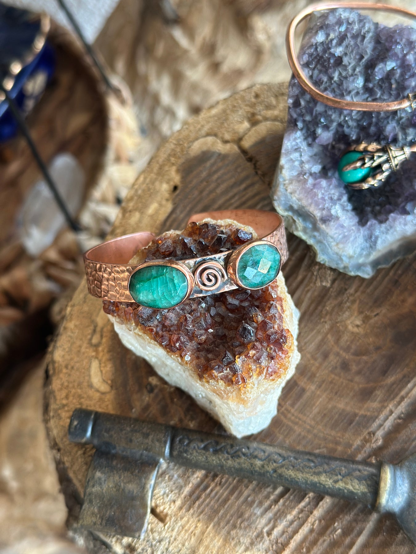 Bu eşsiz bilezikte, iki adet fasetli kesim kök yeşim taşı — şifanın, iç huzurun ve kalp merkezinin taşı — dövme dokulu bakırla buluşuyor. Ortasında yer alan spiral sembol, yaşam enerjisinin döngüsünü ve içsel dönüşümü simgeliyor.